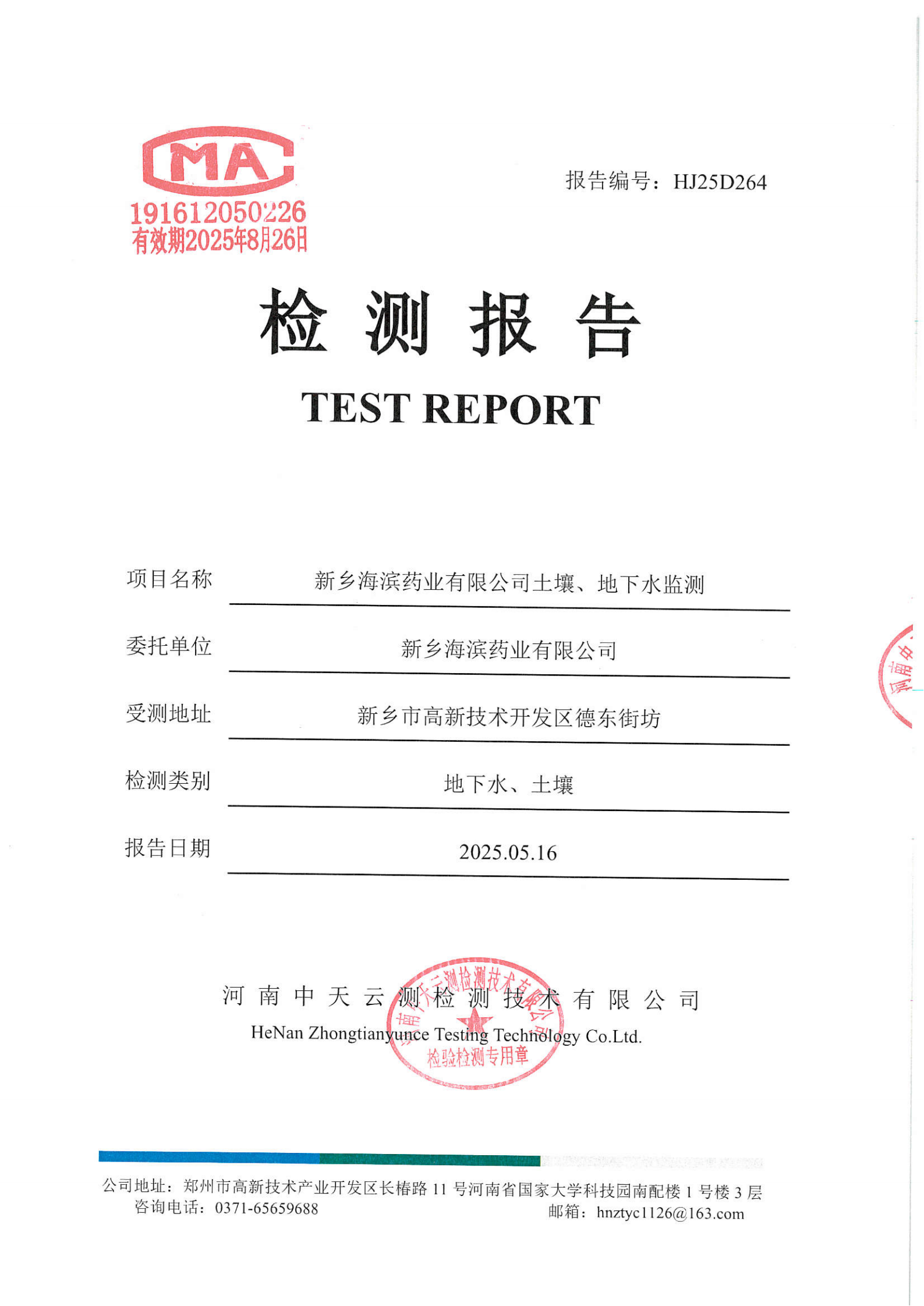 HJ25D264新鄉(xiāng)海濱藥業(yè)有限公司報(bào)告